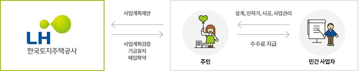 민간사업자와 주민합의체가 사업계획을 수립하여 제안하고, LH는 제안서 검토 후 공동시행약정 체결을 통해 사업 추진