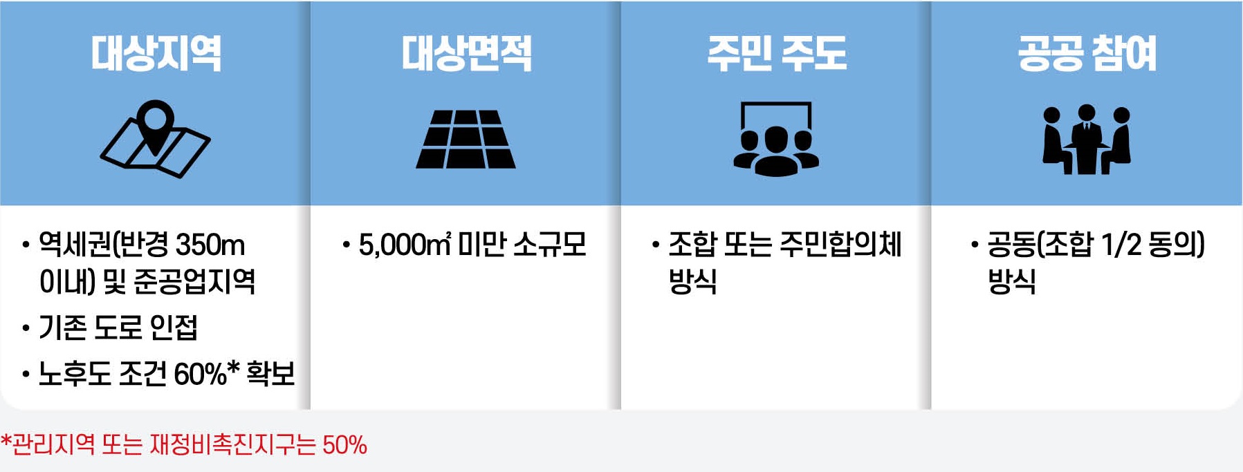 신축, 노후 건물 및 주거, 상업 등 다양한 기능이 혼재된 지역을 소규모로 주민이 주도하여 개발하는 사업