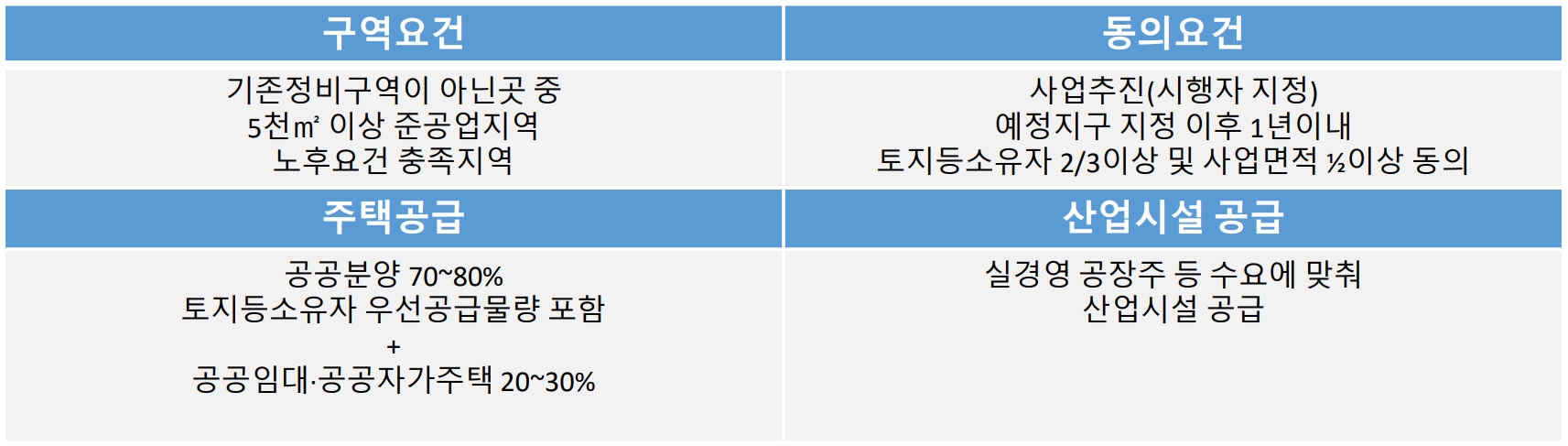 기존 민간사업으로는 개발이 어려워 저이용·노후화되고 있는 준공업 지역을 공공이 지구지정을 통해 부지를 확보하고 양질의 주택과 함께 도시기능 재구조화를 위한 거점 조성을 동시에 추진하는 사업
