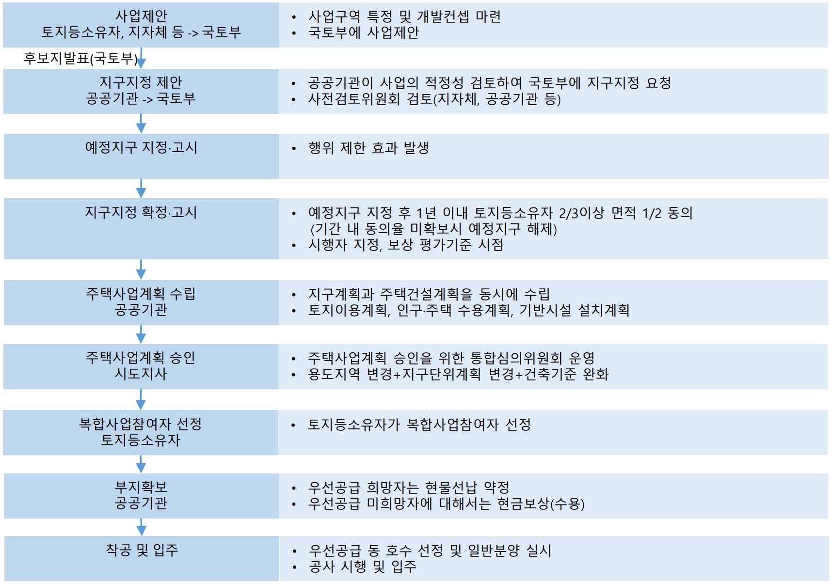 공공이 주도로 시행하되 주민협의체 구성, 복합사업참여자 공모 등 다양한 주체의 참여를 유도하고 규제완화 등 적합한 사업구조 마련 지원